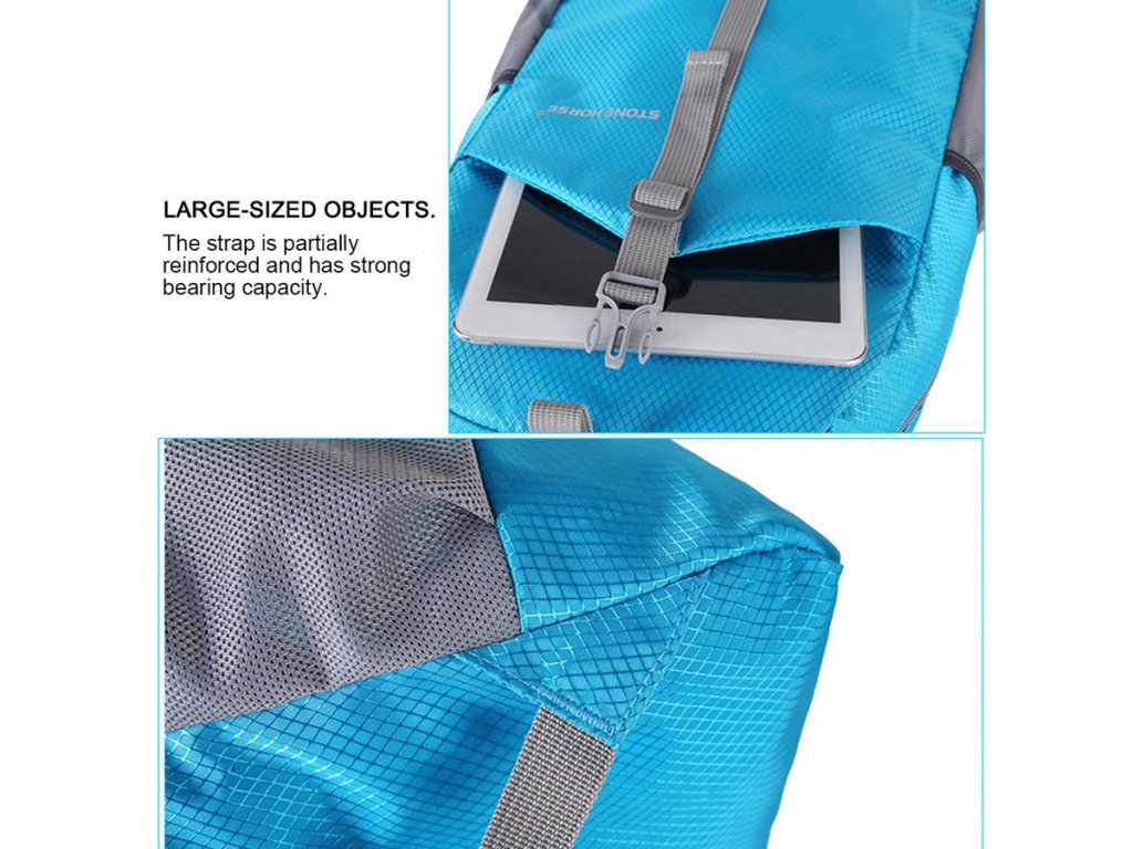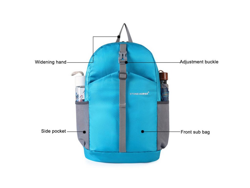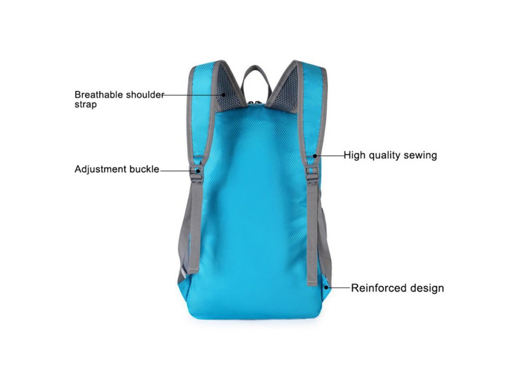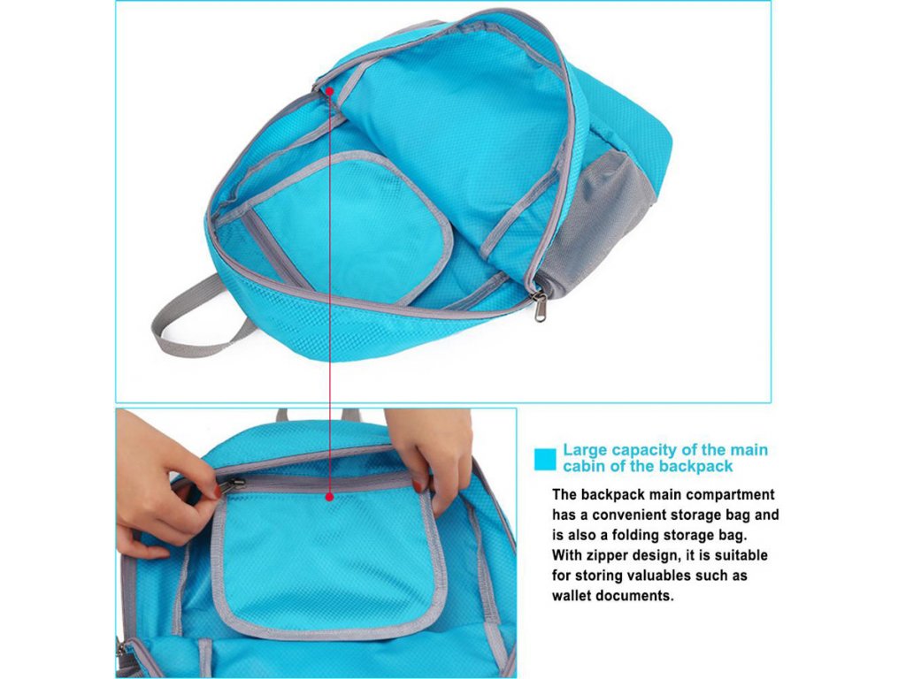 Skladací batoh disponuje objemom 15 l, vďaka čomu sa do neho zmestia všetky veci pre vašu potrebu. Hlavné vrecko je totiž dostatočne veľké, aby znieslo aj väčšie predmety. Naopak vnútorné vrecko je ideálnym miestom na cennosti, ako je hotovosť, kreditné karty alebo cestovný pas. Na oboch stranách mini batohu sú sieťované vrecká, ktoré sú ideálne pre nosenie fľaše s vodou alebo dáždniku.