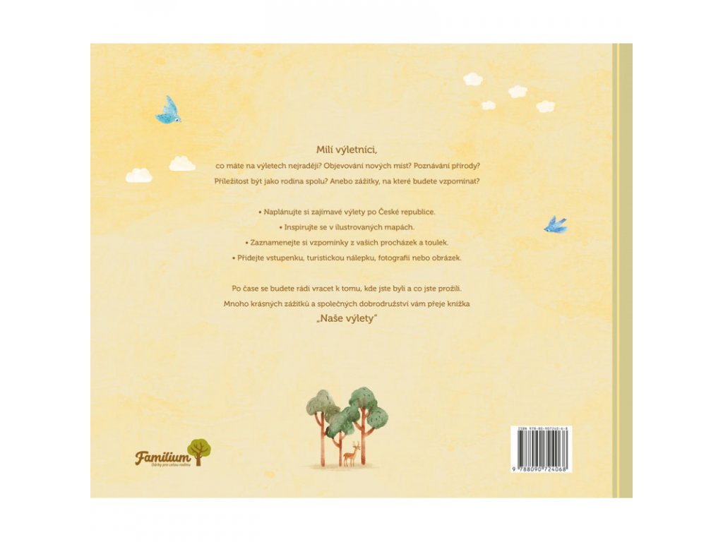Dizajn knihy "Naše výlety" je vhodný pre deti aj dospelých. Zahŕňa farebné obrázky, mapu a ďalšiu grafiku, ktorú ocení každý dobrodruh. Kniha je v pevnej väzbe, vďaka čomu je veľmi odolná a dobre sa s ňou manipuluje. Cestovná kniha Naše výlety pre Českú republiku umožňuje malým i veľkým dobrodruhom zapamätať si a znovu prežiť výlet a podeliť sa o svoje skúsenosti s členmi rodiny, priateľmi, spolužiakmi a učiteľmi.