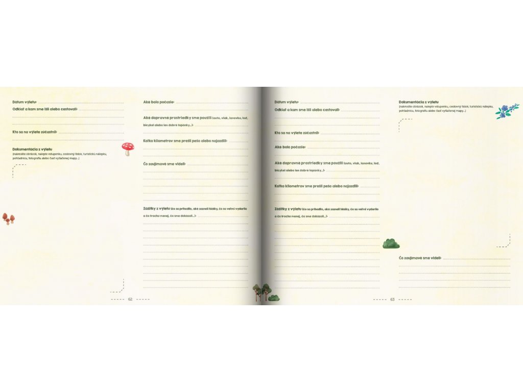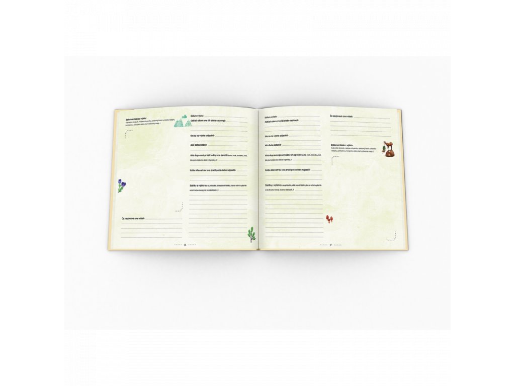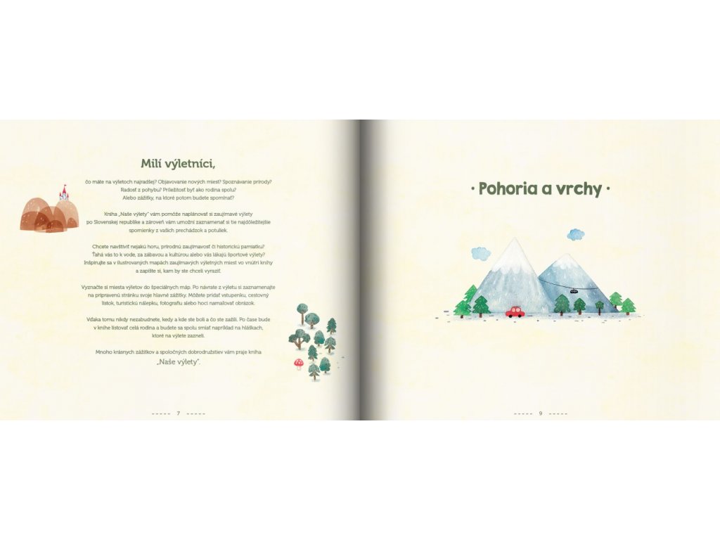 Kniha Naše výlety je rozdelená do siedmich tematických kapitol a v každej si môžete spoločne naplánovať, kam by ste sa chceli vydať. Chcete navštíviť vrchol hory, prírodnú atrakciu alebo historickú pamiatku? Alebo vás to tiahne k vode, do zaujímavých miest, za zábavou a kultúrou, prípadne vás lákajú športové výlety? Inšpirujte sa kreslenými mapami a zapíšte si do knihy, kam by ste chceli ísť.