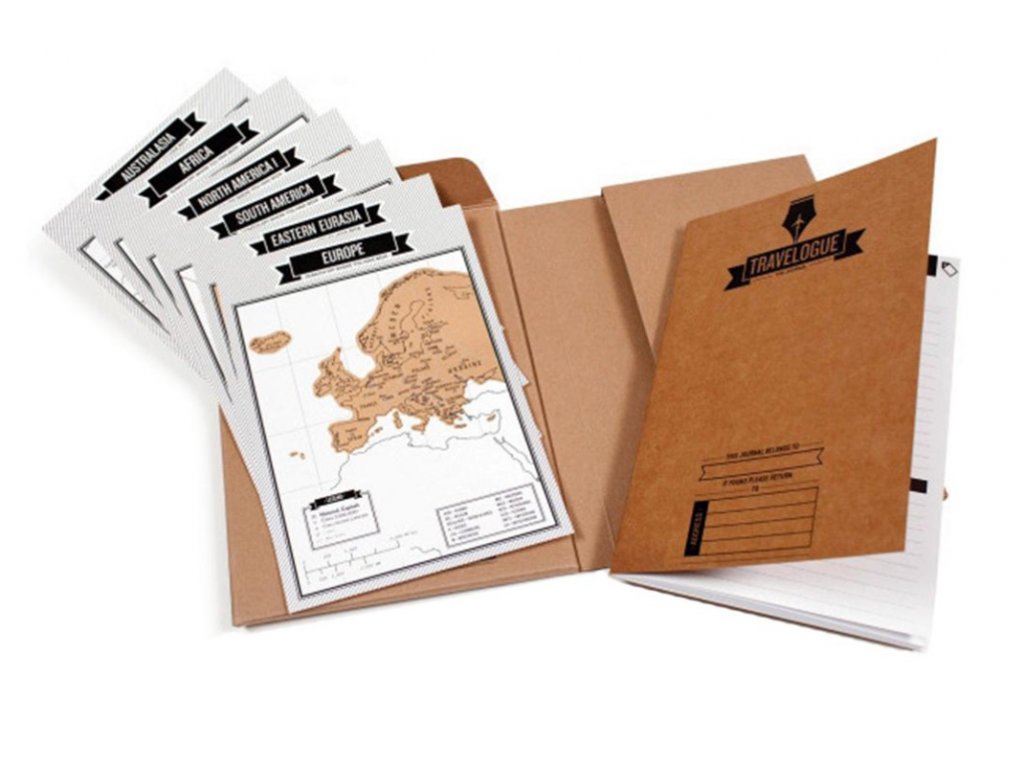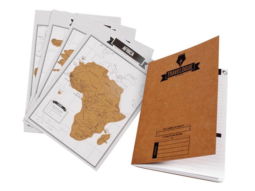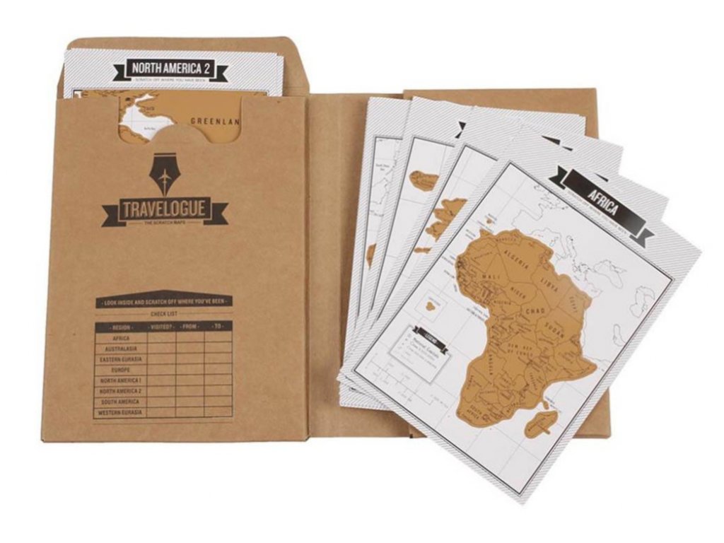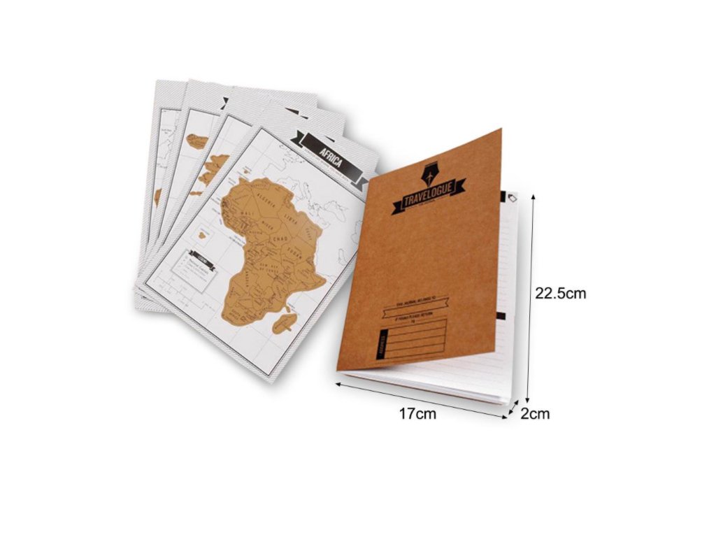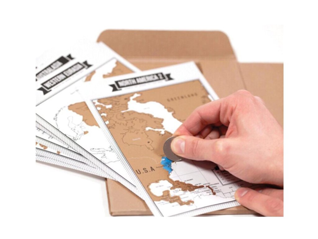 Okrem denníka nájdete v rámci tohto produktu aj osem stieracich máp zobrazujúcich jednotlivé kontinenty. Postupne si tak môžete zotrieť jednotlivé krajiny, ktoré navštívite. Následne si ich môžete vystaviť a pochváliť sa pred svojimi priateľmi.