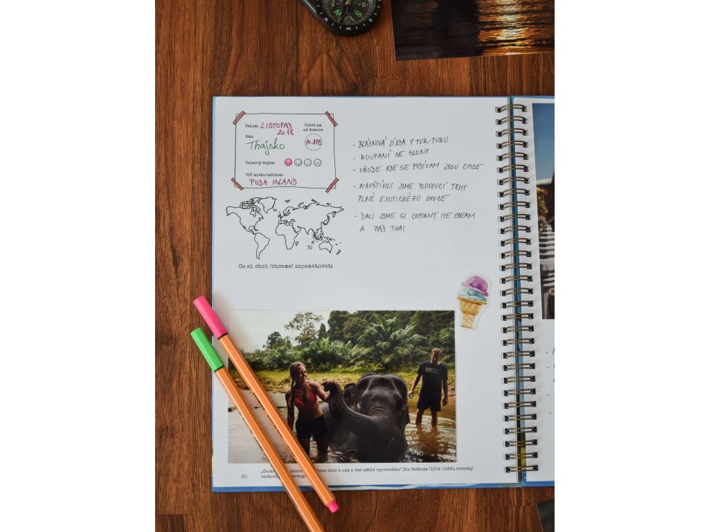 Napíšte, kam idete. Naplánujte si baliaci zoznam. Zaznamenajte si, čo ste zažili na ceste tam i späť. Zapíšte si nezabudnuteľné okamihy. Vložte fotografie. Ohodnoťte každý deň a zakrúžkujte svoju náladu!