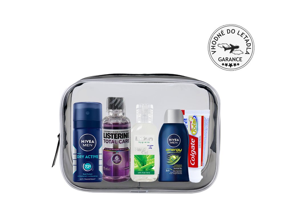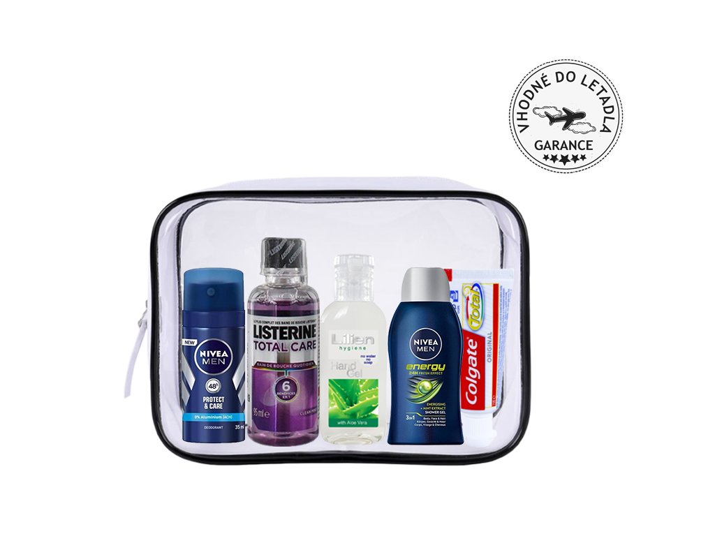 Cestovná kozmetická sada ideálna pre dokonalú čistotu vašich rúk, zubov i úst. Nájdete v nej sprchový gél so šampónom 2v1, dezodorant, zubnú pastu, ústnu vodu a dezinfekčný gél. Všetko zastúpené značkami Nivea Men, Colgate, Listerine a Lilien.