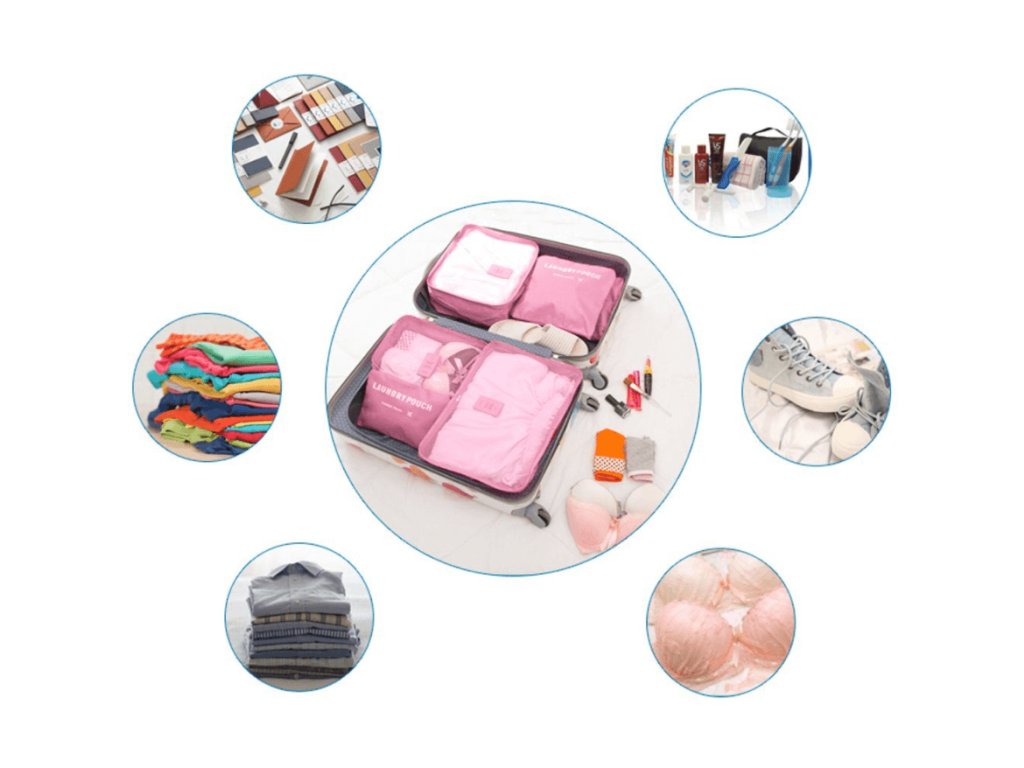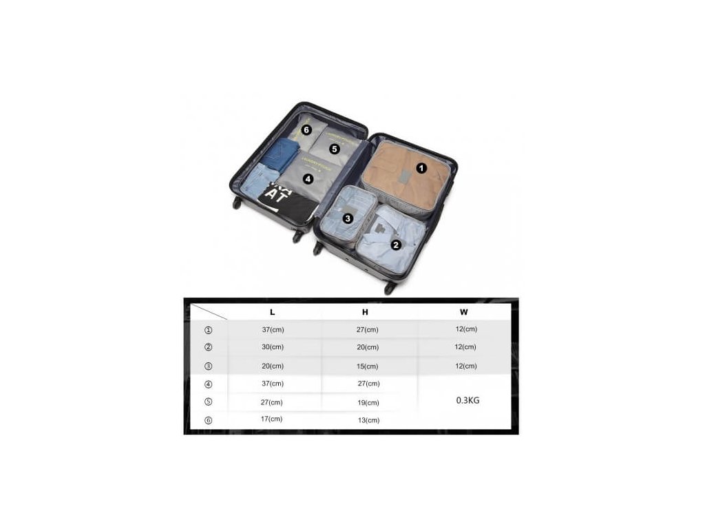 Táto sada obsahuje 3 organizéry na oblečenie s priedušnou sieťovinou a 3 nepremokavé obálky na drobnosti. Každý kus má inú veľkosť, čo umožňuje efektívne využitie priestoru vo vašom kufri.