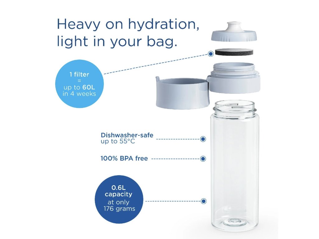 Fľaša BRITA Fill&Go Vital je vyrobená z odolného plastu bez obsahu BPA a je vybavená praktickým pútkom na pohodlné nosenie. Jej stlačiteľný dizajn a ľahké otváranie umožňuje pohodlné použitie jednou rukou, nech už ste kdekoľvek. Okrem toho je fľaša vhodná na umývanie v umývačke (do 55 °C), čo uľahčuje jej údržbu.