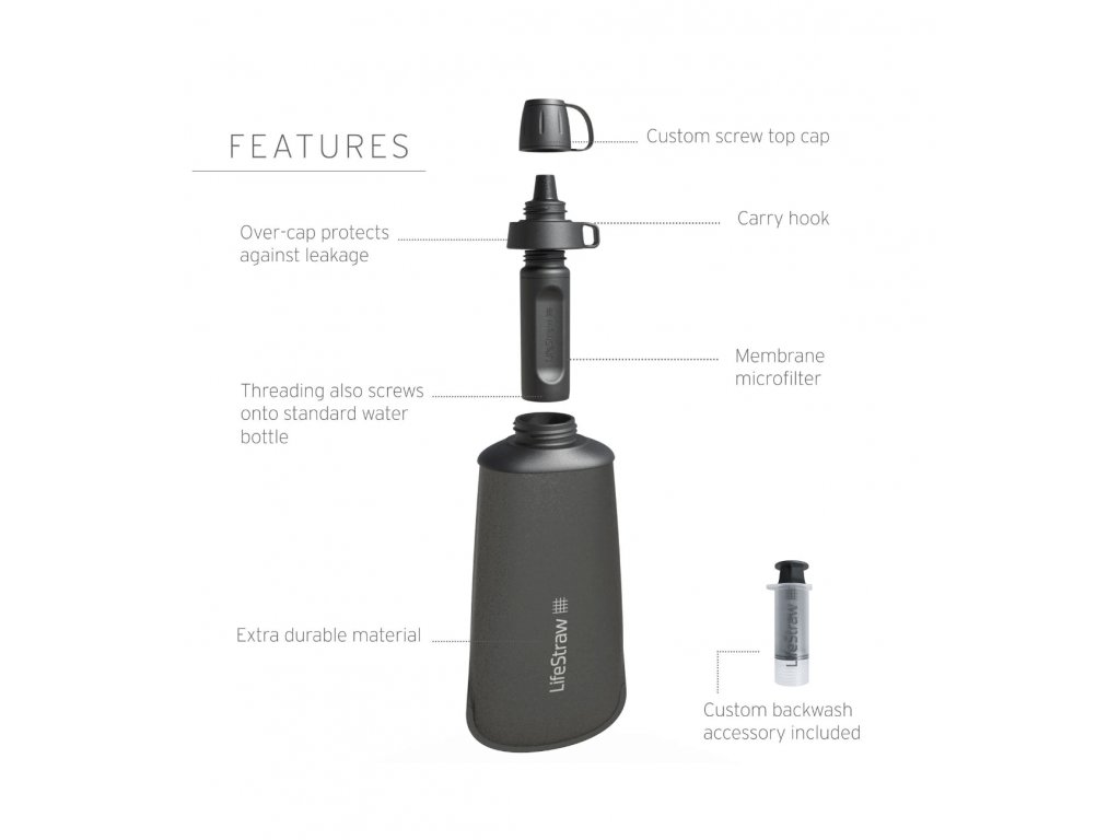 Filtračná fľaša je vyrobená z tritanového plastu neobsahujúca škodlivú zložku BPA. Dokáže odfiltrovať až 2 000 litrov kontaminovanej vody. A v čom vlastne spočíva samotná filtrácia? Technológia LifeStraw® disponuje špeciálnou navrhnutou technológiou mikrofiltráciou z dutých vlákien, ktorá sa tiež využíva v priemyselných továrňach na vodu, ktoré majú na starosti vodovody miest i veľkomiest. Vnútorná časť filtra LifeStraw® sa skladá z obrovského počtu dutých vlákien, pričom každé vlákno má vo svojich stenách póry s priemerom 0,2 mikrónu (5x menši ako je priemer ľudského vlasu). Keď voda prechádza týmito vláknami, do póru môže vniknúť iba čistá voda blokujúca 99,99 % baktérií, parazitov a ďalších nečistôt ohrozujúcich zdravie ľudí.
