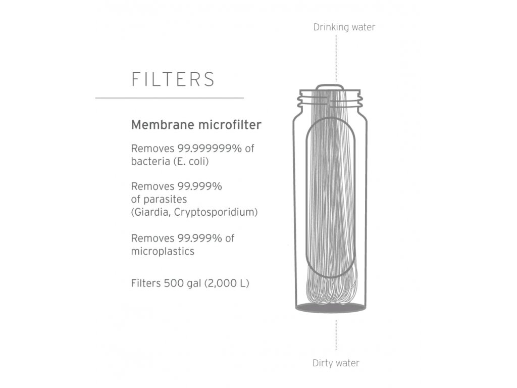 - Chráni pred 99,99 % baktérií (vrátane E.coli, Salmonella), 99,99 % parazitom (vrátane Giardia a Cryptosporidium), 99,99 % mikroplastom, chlóru, organických chemikálií a piesku, bahna alebo zakaleniu