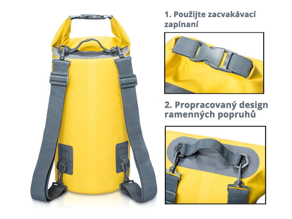 Lodný vak je vybavený dvoma ramennými popruhmi, ktoré možno prispôsobiť za pomoci nastaviteľnej dĺžky. Vezmite do úvahy aj to, že prispôsobiteľnosť batohu budete chcieť využiť pri plavbe v kajaku, pri surfovaní, kempovaní, rybárčení, plávaní, kanoistike alebo pri ďalších vodných športoch.