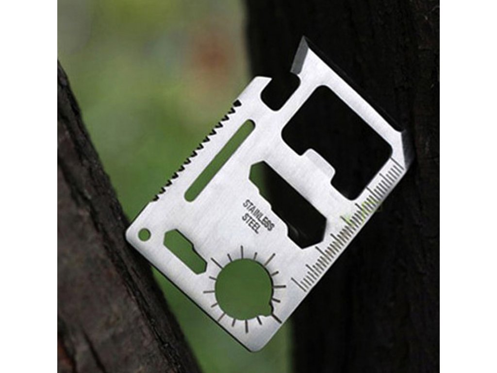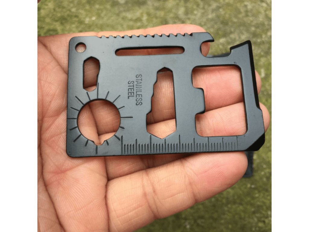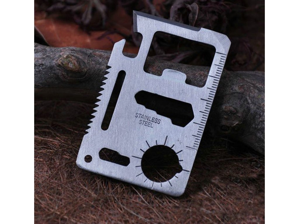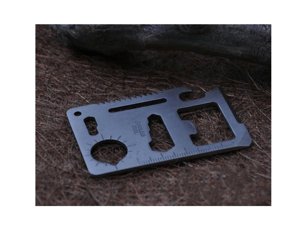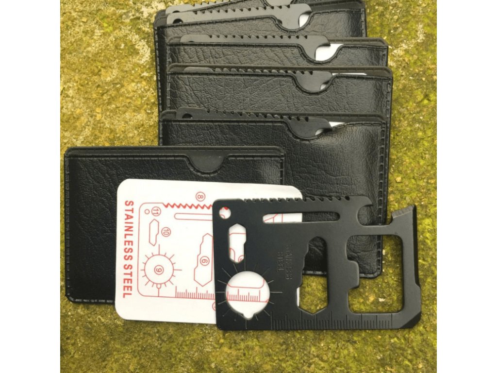 Multifunkčná karta prežitia s 11 užitočnými nástrojmi v jednej kovovej karte veľkosti kreditnej karty plní vďaka svojej rozmanitosti požiadavky aj tých najnáročnejších cestovateľov.