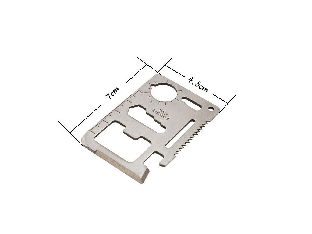 Táto multifunkčná karta prežitia je vyrobená z nerezovej ocele, ktorá zaručene nezhrdzavie a ani sa neohne, čím zaisťuje maximálnu trvanlivosť. Jej veľkosť je ideálna do peňaženky alebo vrecka s rozmermi 6,9 x 4,5 cm.