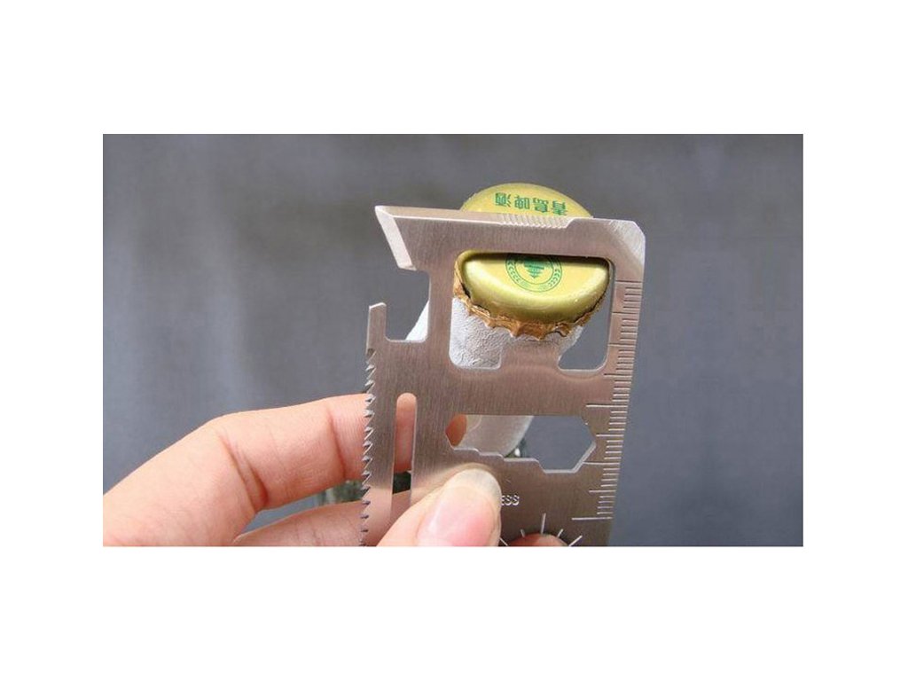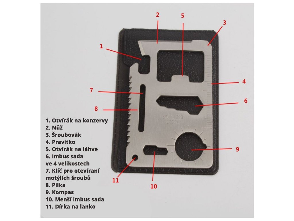 Multifunkčná karta z nerezovej ocele plní 11 funkcií. A to všetko v jednom nástroji. Zahŕňa otvárač na konzervy, ostrý nôž, skrutkovač, pravítko, 4 polohový imbusový kľúč, motýľový skrutkovač, ale aj pílový kotúč, 2-polohový imbusový kľúč, otvor na kľúč, otvárač na fľašu a smerovač.