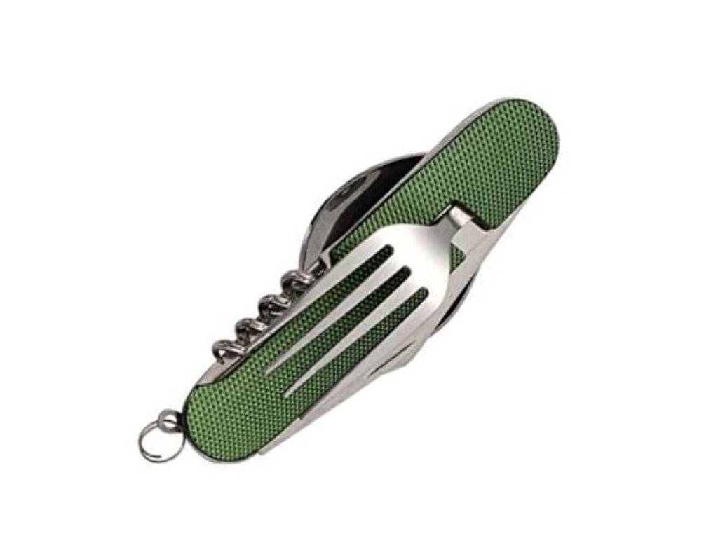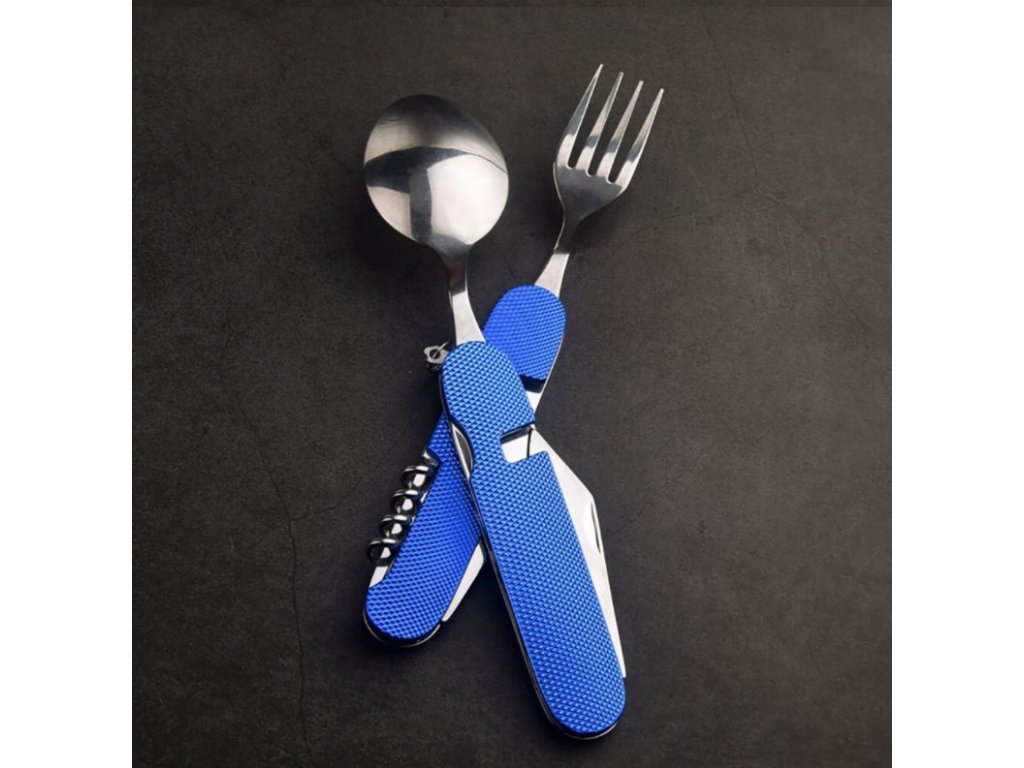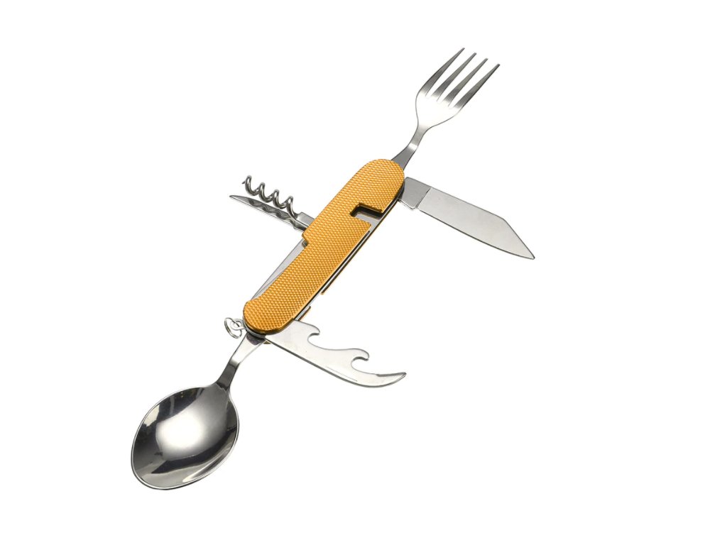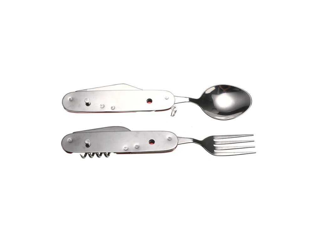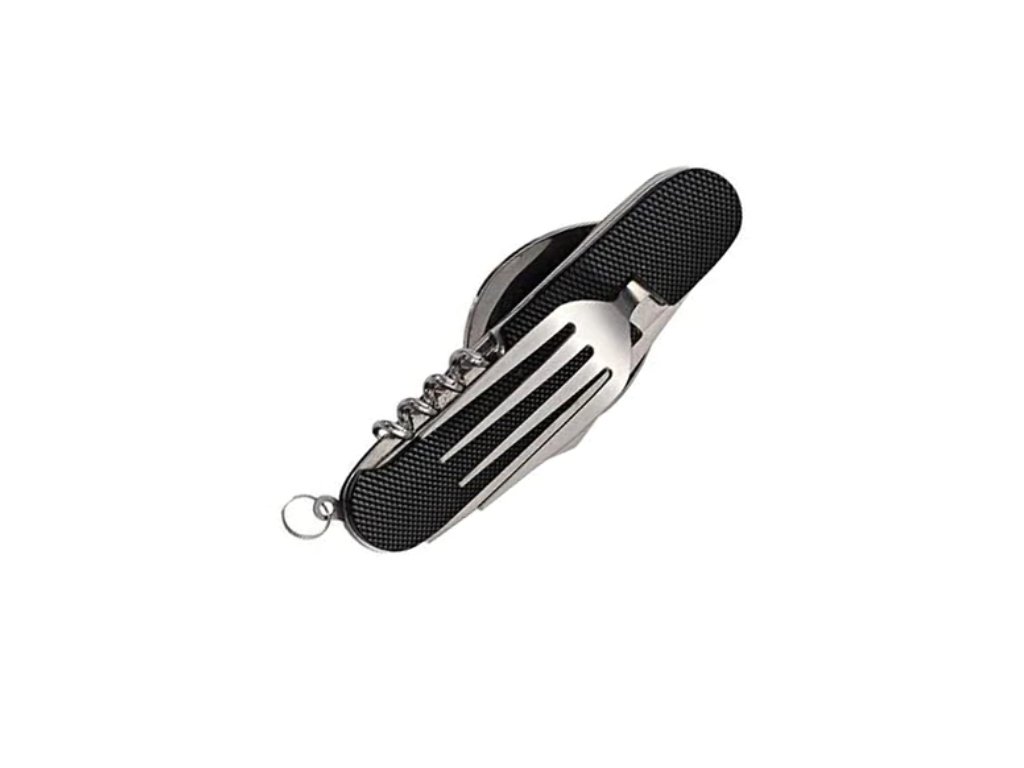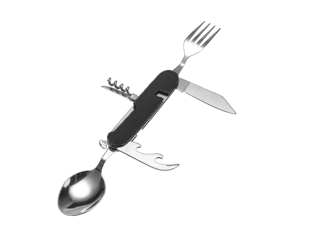 Tento skladací príbor obsahuje lyžicu, vidličku, nôž, vývrtku bodec a otvárač na fľaše. Kompaktnosťou a ľahkosťou sa vojde do bočného vrecka vášho batohu, do zásuvky alebo iného úložného priestoru. Či už tento multifunkčný skladací príbor použijete v kempe alebo len tak doma, použitý materiál nerezovej ocele zaistí vášmu príboru dlhú životnosť. Rukoväť je vyrobená z hliníka a dá sa ľahko vyčistiť.