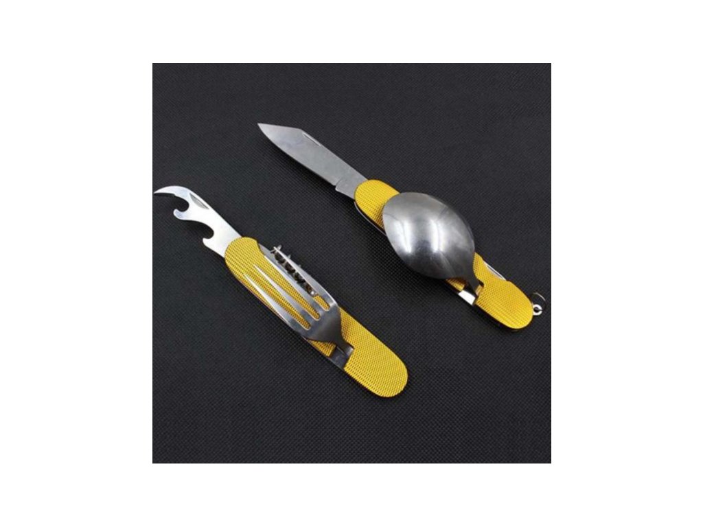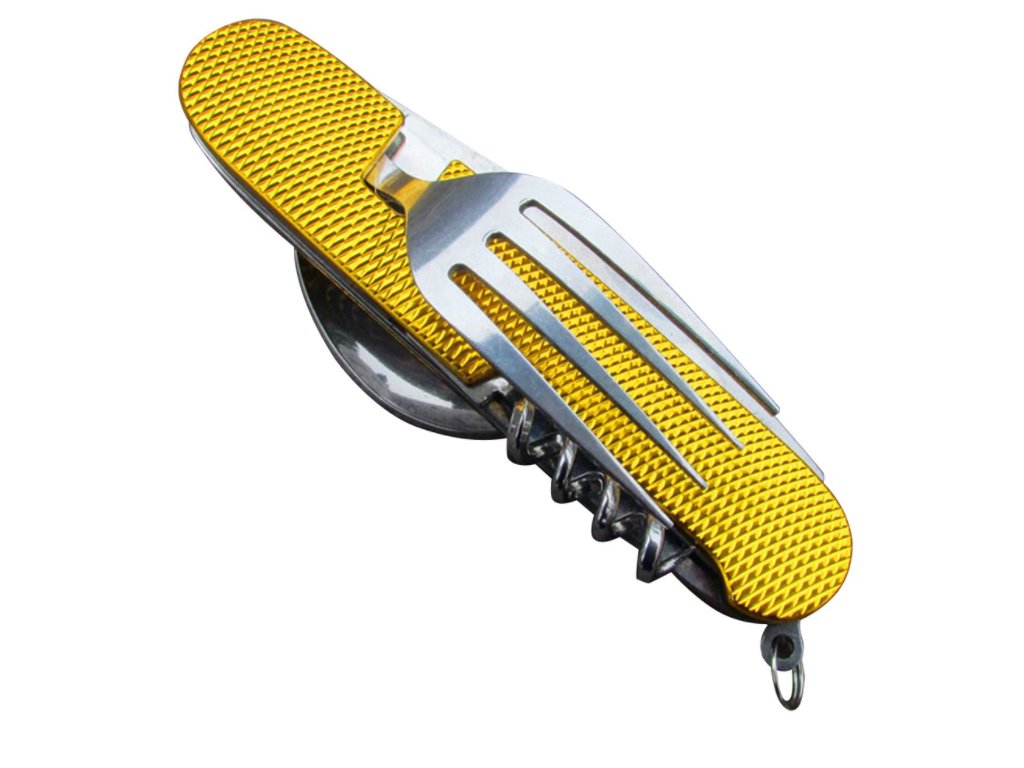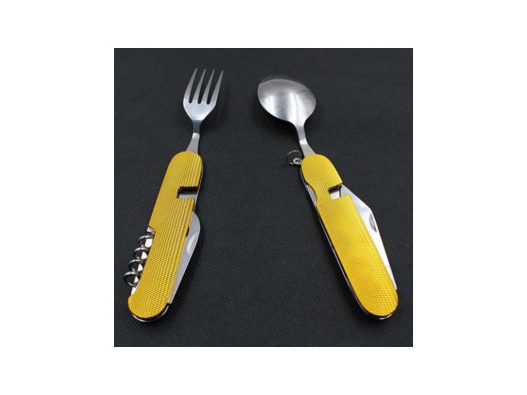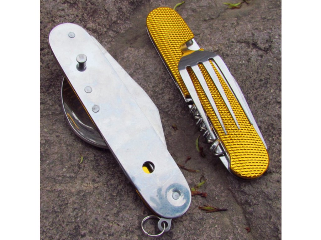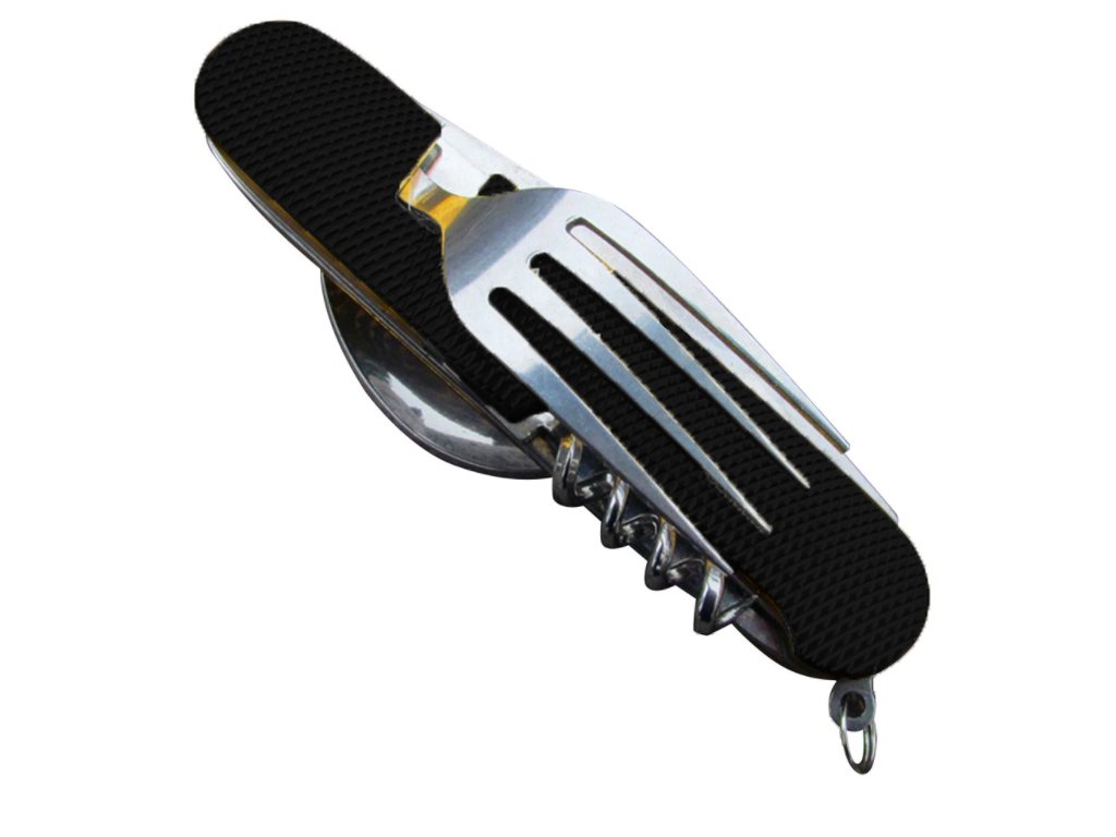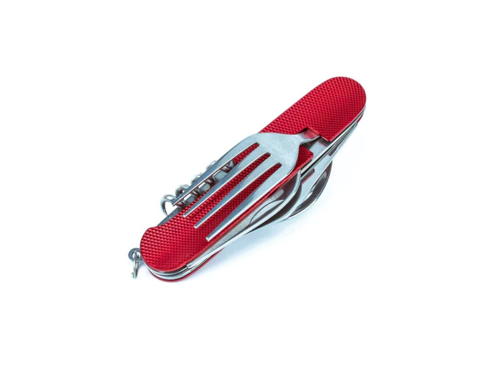 Tento skladací príbor obsahuje lyžicu, vidličku, nôž, vývrtku bodec a otvárač na fľaše. Kompaktnosťou a ľahkosťou sa vojde do bočného vrecka vášho batohu, do zásuvky alebo iného úložného priestoru. Či už tento multifunkčný skladací príbor použijete v kempe alebo len tak doma, použitý materiál nerezovej ocele zaistí vášmu príboru dlhú životnosť. Rukoväť je vyrobená z hliníka a dá sa ľahko vyčistiť.