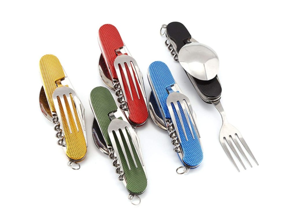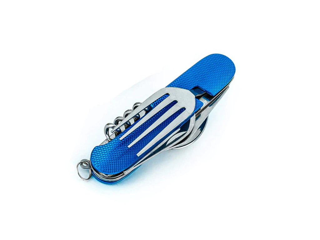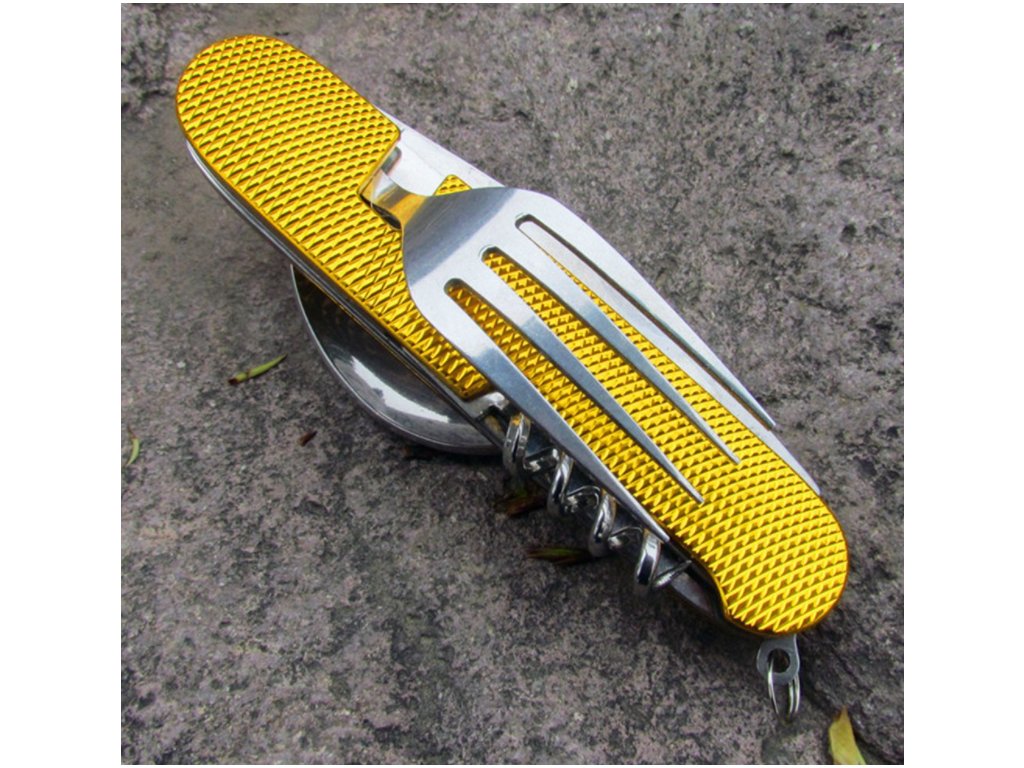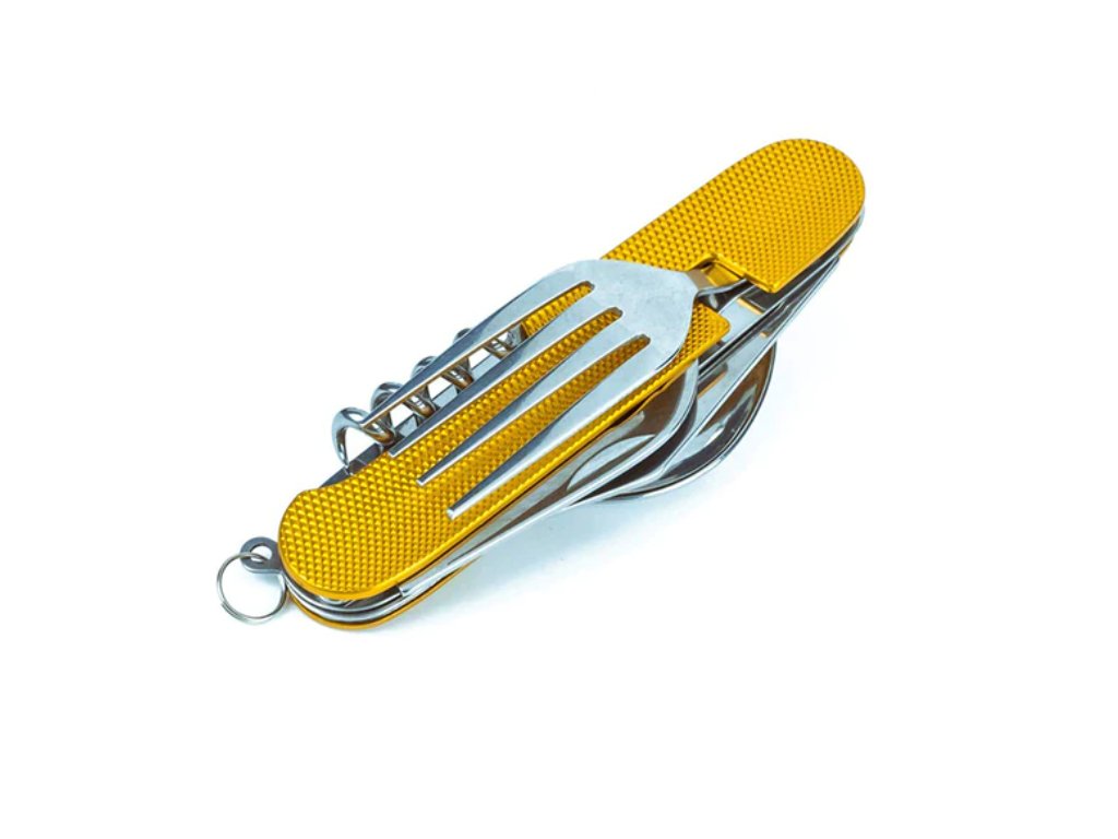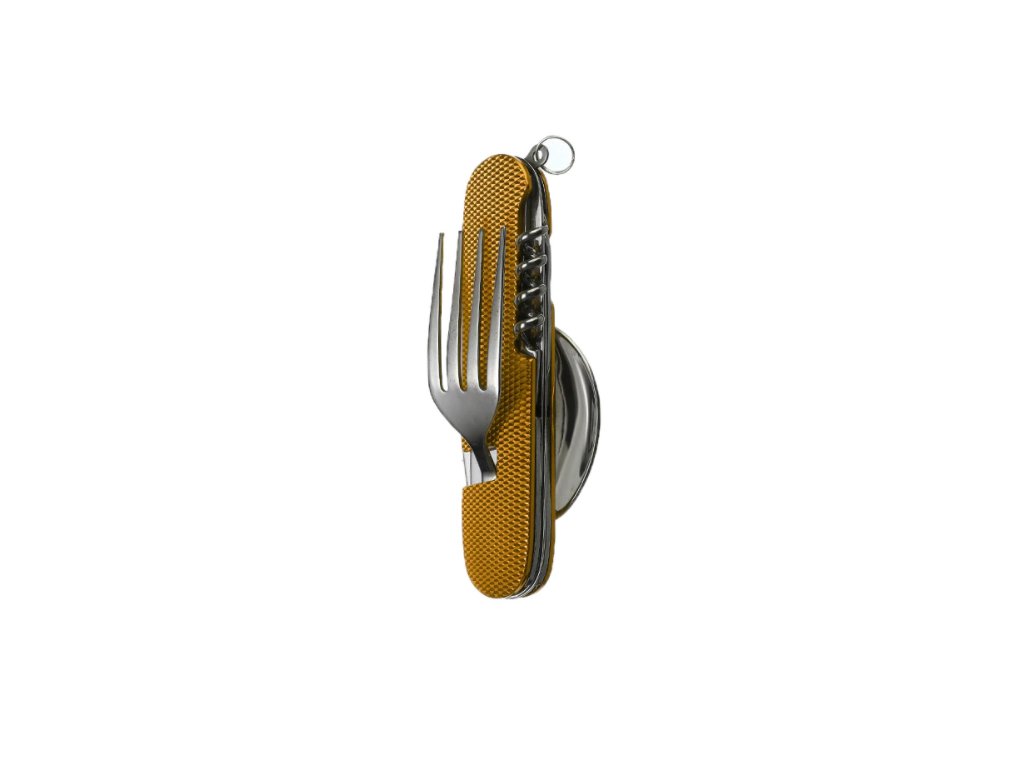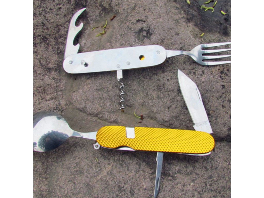Tento skladací príbor obsahuje lyžicu, vidličku, nôž, vývrtku bodec a otvárač na fľaše. Kompaktnosťou a ľahkosťou sa vojde do bočného vrecka vášho batohu, do zásuvky alebo iného úložného priestoru. Či už tento multifunkčný skladací príbor použijete v kempe alebo len tak doma, použitý materiál nerezovej ocele zaistí vášmu príboru dlhú životnosť. Rukoväť je vyrobená z hliníka a dá sa ľahko vyčistiť.