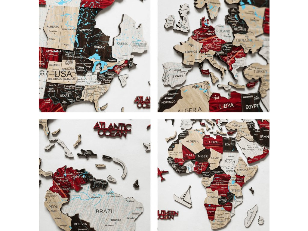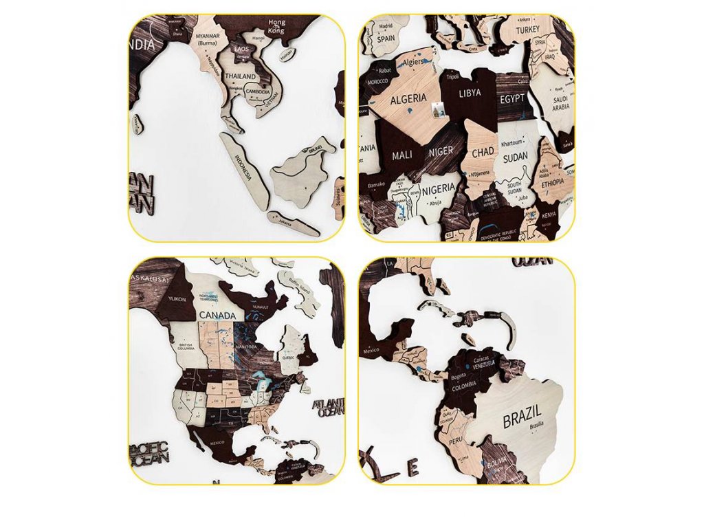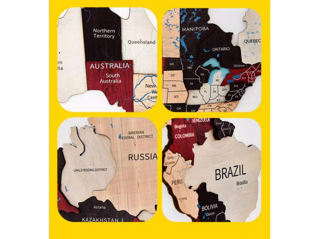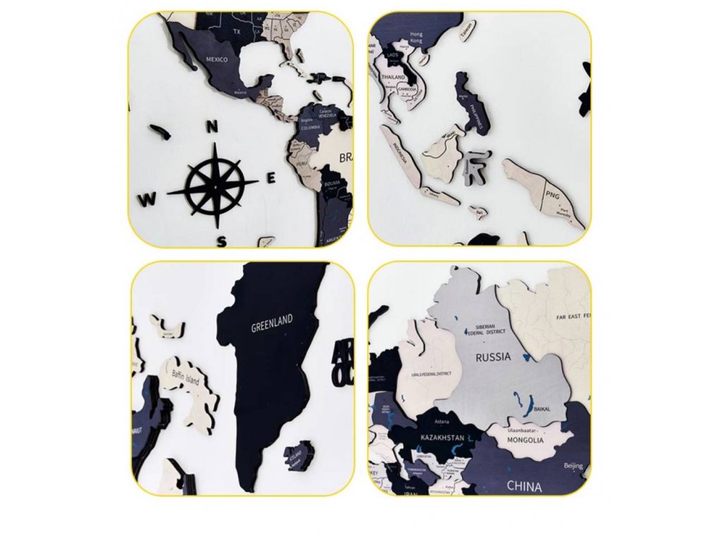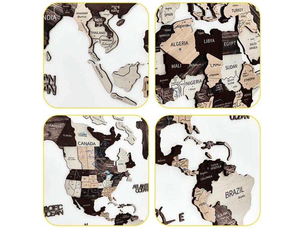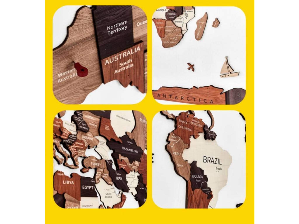 - Mapa sa skladá z väčších drevených panelov: Severná Amerika, Južná Amerika, Európa a Ázia, Afrika, Austrália, Grónsko a rôzne menšie ostrovy. Funguje ako puzzle. Montáž je veľmi jednoduchá a zaberie približne 2 hodiny času.