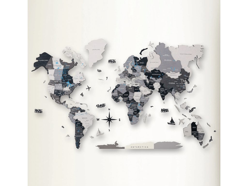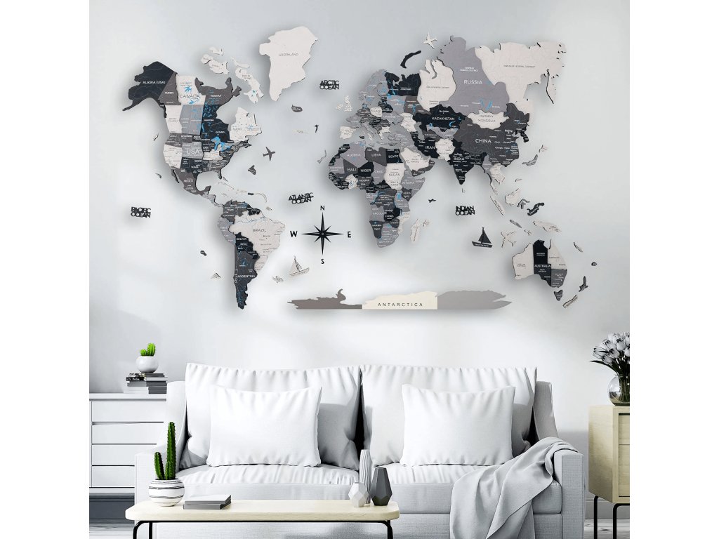 Drevená mapa sveta na stenu – Sivá