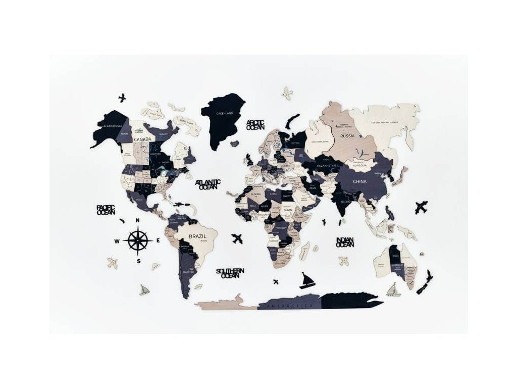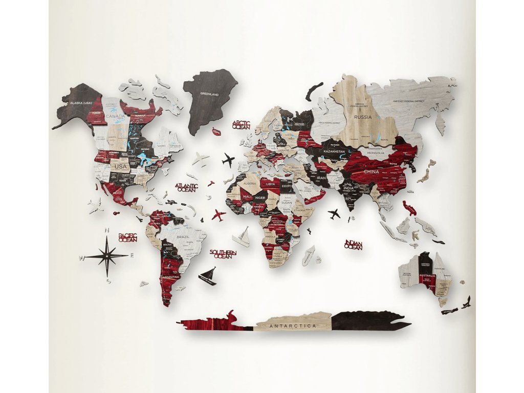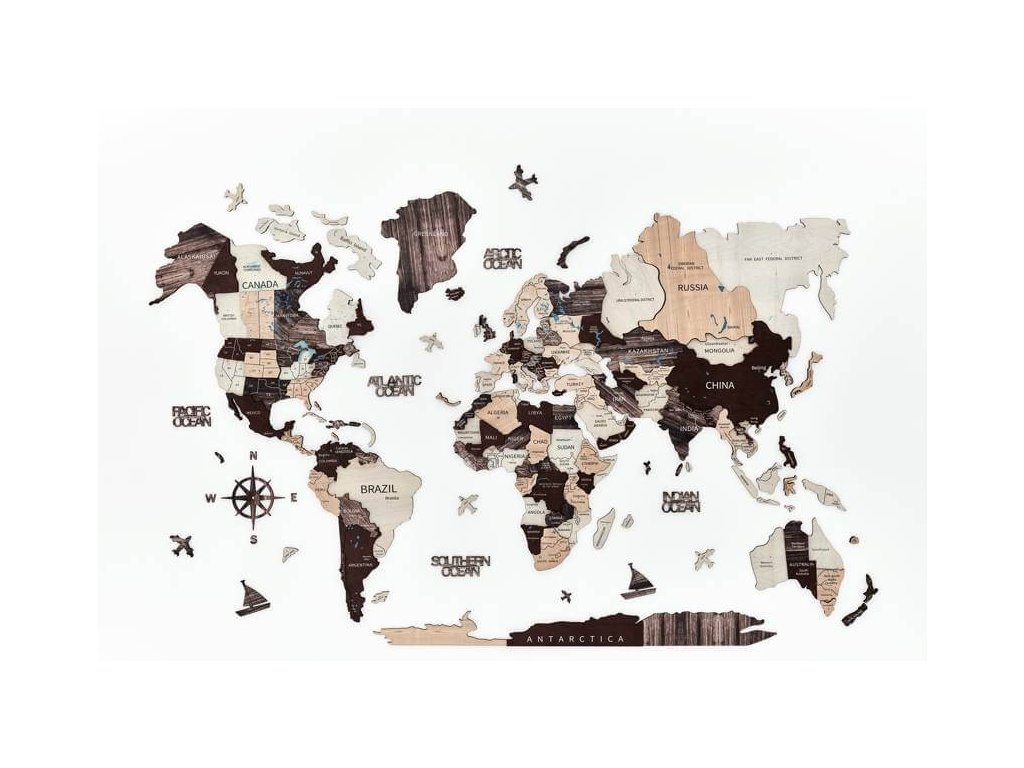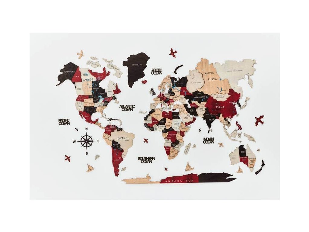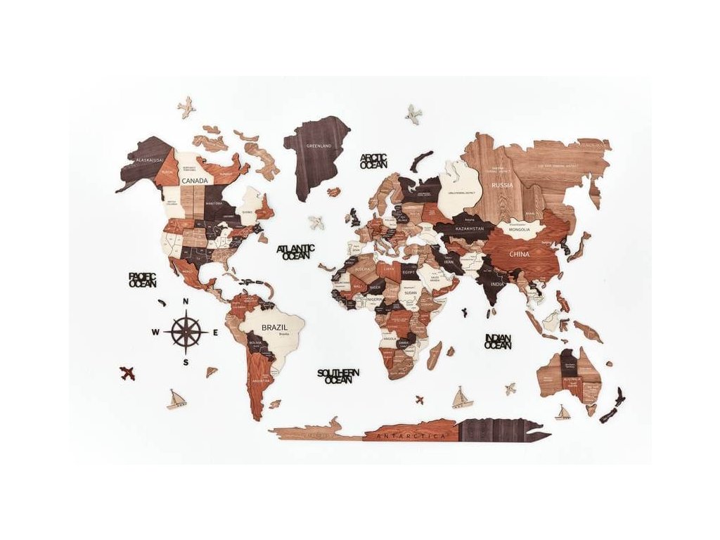 Drevená mapa sveta na stenu bude dokonalým darčekom pre milovníkov cestovania alebo pre rodinu, ktorá hľadá dobrodružstvo! Názvy oceánov, drevené lietadlá, lode a kompas robia z tejto mapy sveta dokonalú drevenú nástennú dekoráciu pre váš domov alebo kanceláriu. Táto drevená mapa sveta bola vytvorená ako dokonalý darček pre cestovateľov so skvelým vkusom pre interiérový dizajn. Preskúmajte svet z pohodlia svojho domova.