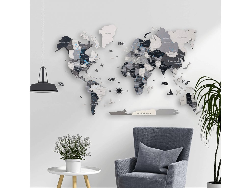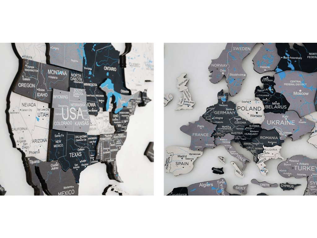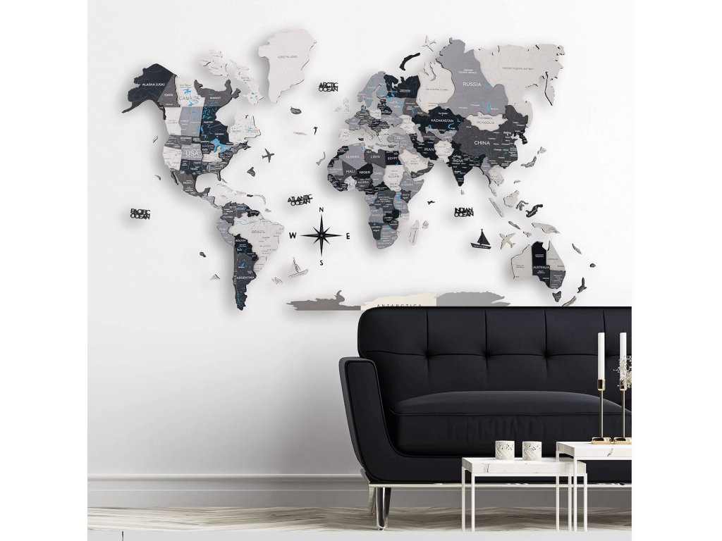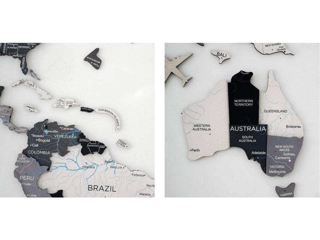 Ponúkame široký výber farieb, 2 veľkosti a krásne možnosti príslušenstva na dosiahnutie vzhľadu, ktorý najlepšie zodpovedá vášmu štýlu. Vyrobené z vysokokvalitnej brezovej preglejky s dokonalými detailmi gravírovania. 3D drevená mapa sveta je tou najúžasnejšou dekoráciou pre každého cestovateľa: minimalistická, zmysluplná a skutočne inšpirujúca!