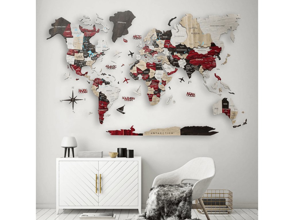 Drevená mapa sveta na stenu – Červená