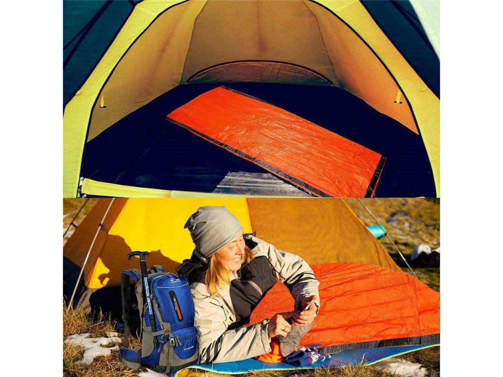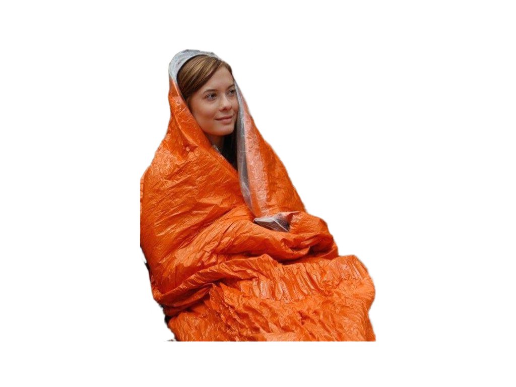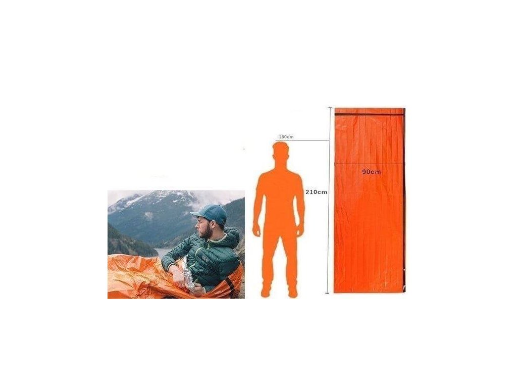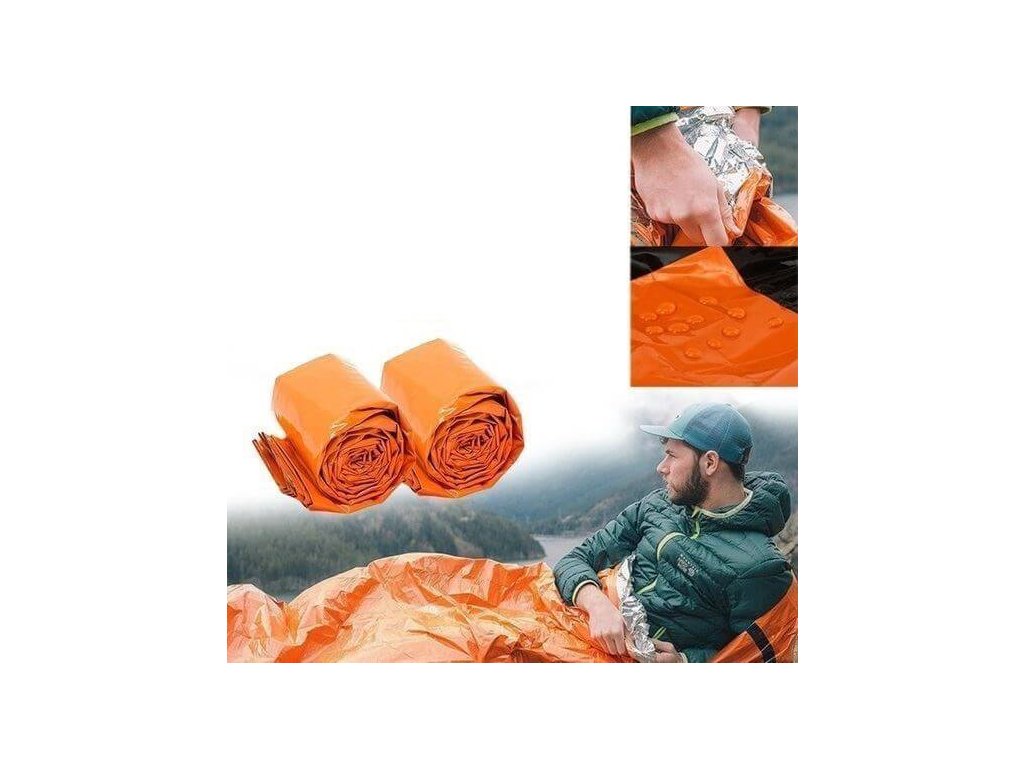 Núdzová prikrývka e nevyhnutná pre tých, ktorí cestujú do vzdialenejších štátov, je ľahký, ale odolný proti roztrhnutiu a je vyrobený z jasne oranžového, tepelne reflexného metalizovaného LDPE, ktorý je vodotesný, vetruodolný, tichý a opakovane použiteľný.