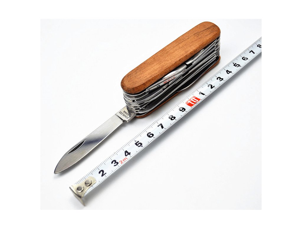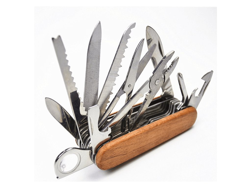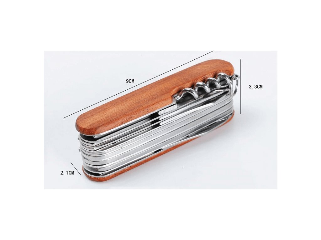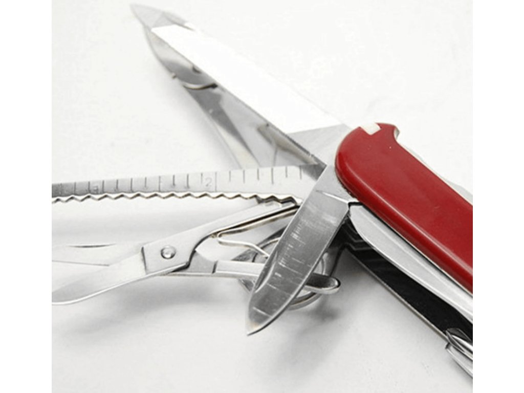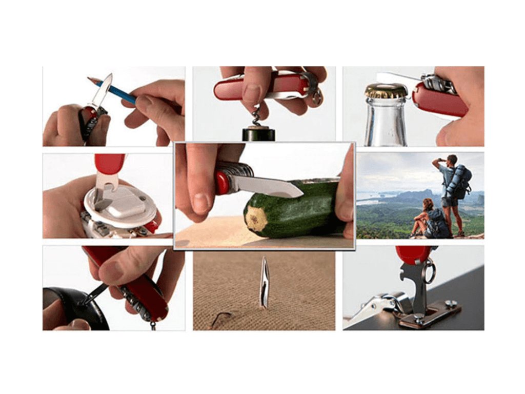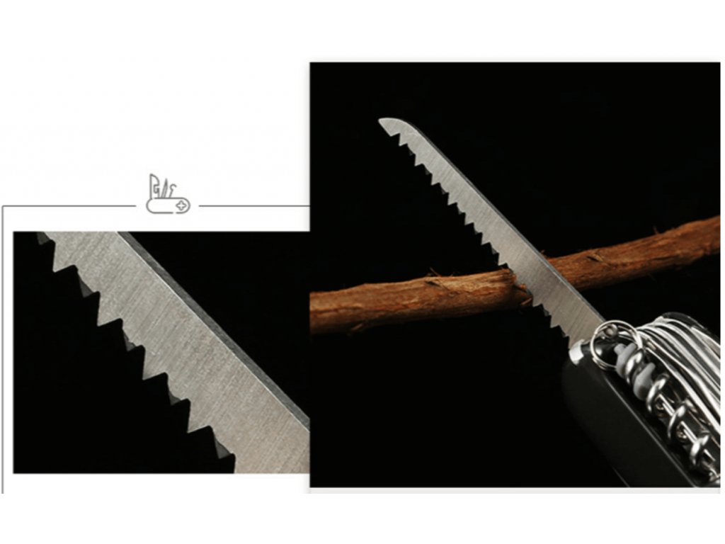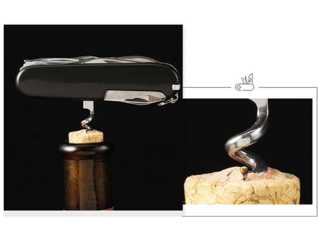 Tento vreckový nôž kombinuje hneď niekoľko dôležitých nástrojov: veľká čepeľ, malá čepeľ, vývrtka, otvárač na konzervy s malým skrutkovačom, otvárač na fľaše so skrutkovačom a odizolovaním drôtu, dierovací otvor, kľúčenka, nožnice, viacúčelové háky a píla na drevo. Je tak nenahraditeľným nástrojom na cestovanie, na doma alebo pri kempovaní.