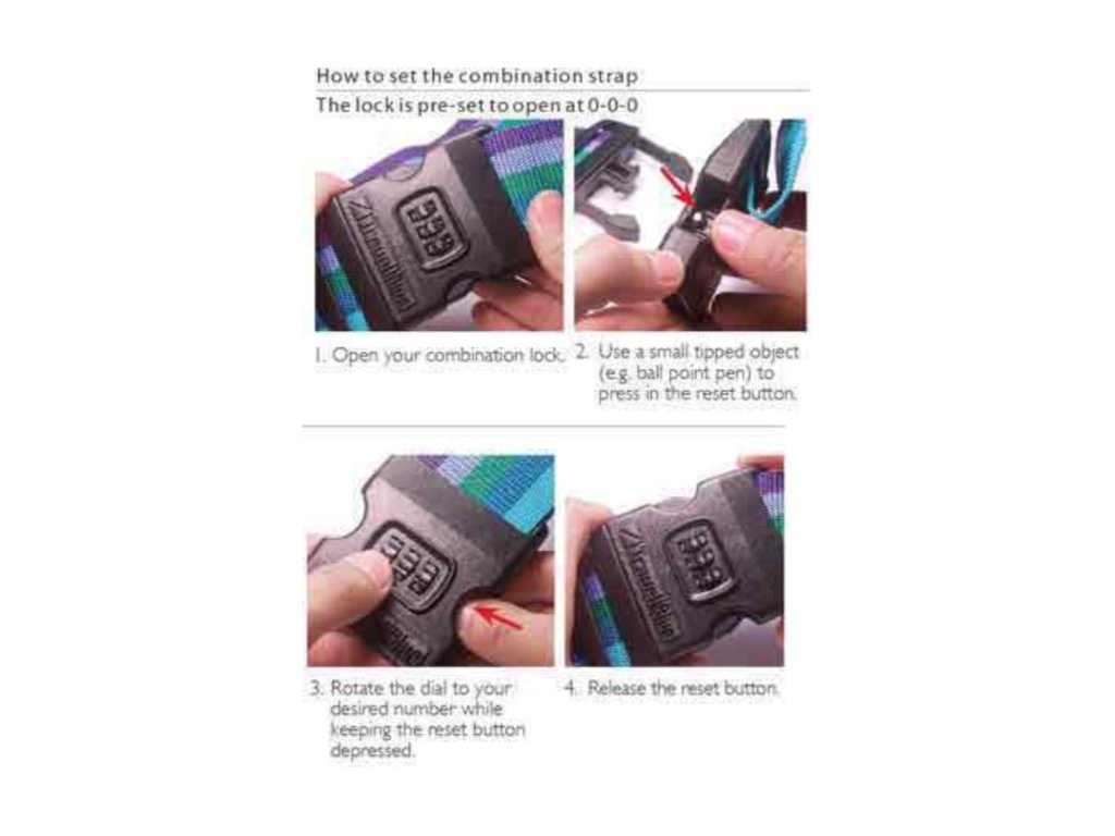 Bezpečný číselný zámok: popruh disponuje bezpečnou uzatváracou sponou, ktorú uzamknete za pomoci 3 číselného zámku. Pozrite sa prosím na podrobné kroky v obrázku nižšie a nastavte si svoj tajný kód hneď na začiatku. Prednastavený kód je 0-0-0. Po zmene tohto kódu na nový si ho starostlivo zapamätajte, inak už nebudete môcť zámok otvoriť.