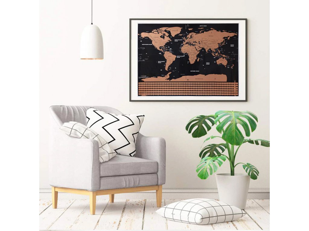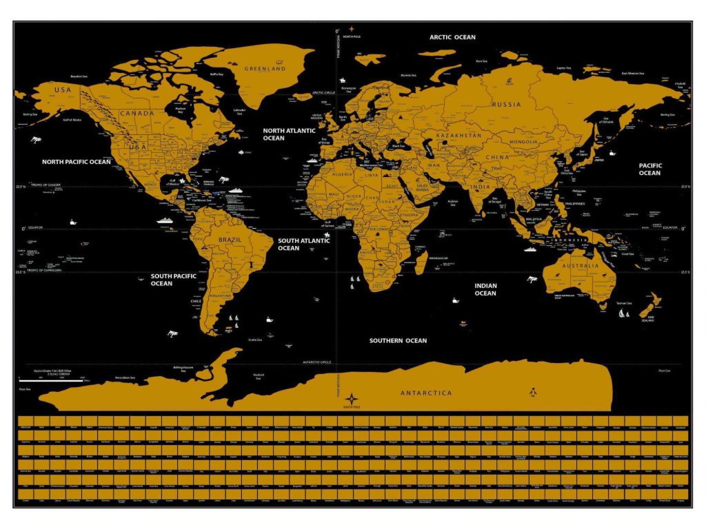 Jedna z prvých stieraciach máp sveta, aké kedy boli vyrobené. Inovatívny dizajn je vyrobený na recyklovateľnom papieri najvyššej kvality spolu s odnímateľnou zlatou fóliou na hornej vrstve.