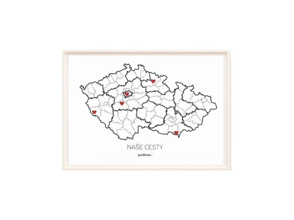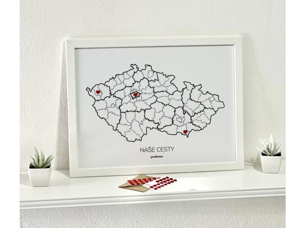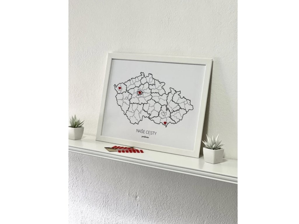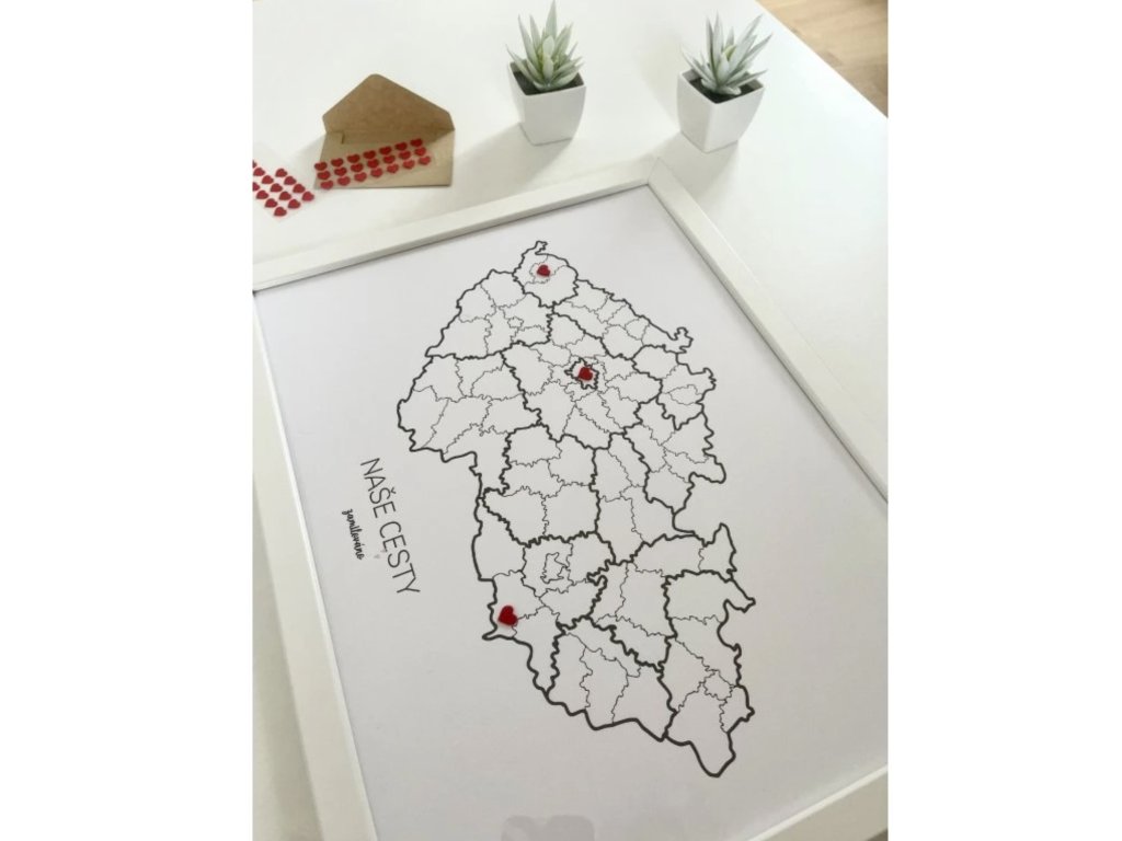 Pamätná mapa „Naše cesty - Česká republika“ je viac ako len dekorácia. Je to osobný záznam vašich spoločných cestovateľských dobrodružstiev a zážitkov. Táto zarámovaná mapa vo veľkosti A3 (30 x 40 cm) vám umožní označiť miesta, ktoré ste navštívili, mini srdiečkami a vytvoriť tak jedinečný spomienkový príbeh priamo na vašej stene. Namiesto toho, aby vaše spomienky zostali zabudnuté v telefóne, táto mapa vám ich bude denne pripomínať.