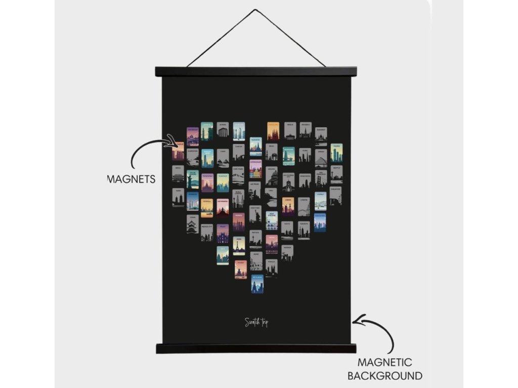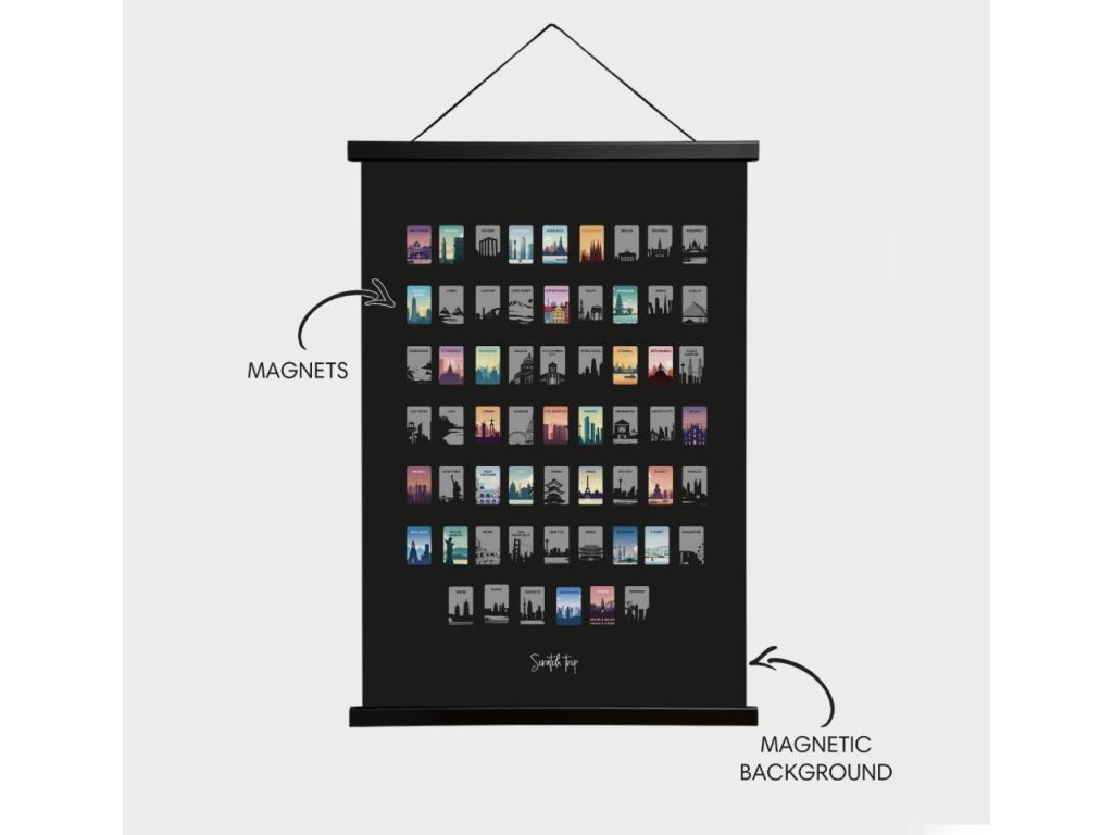 Magnetický plagát je perfektnou voľbou ako darček pre všetkých vášnivých cestovateľov. Hodí sa na narodeniny, výročia, Vianoce alebo len tak, keď chcete niekoho potešiť. Vďaka modernému dizajnu a praktickému spracovaniu si nájde miesto na každej stene alebo dokonca na chladničke.