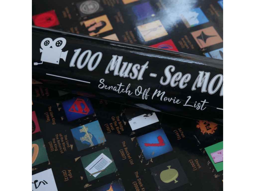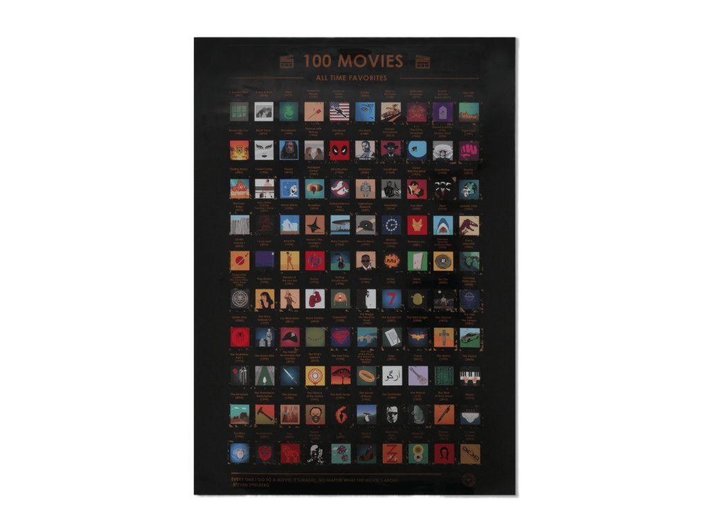 Pod zlatou vrstvou odhaľte farebnú postavičku alebo ikonku a odkryjte svoje najobľúbenejšie filmy. Plagát 100 filmov, ktoré musíte vidieť, kombinuje originálne ilustrácie, ktoré nikde inde nenájdete.