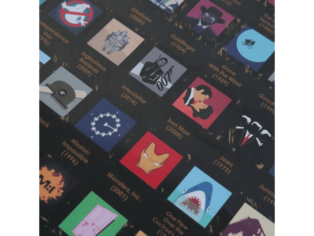Od klasiky ako Hriešny tanec, Forrest Gump, cez novinky ako Bohemian Rhapsody či Zrodila sa hviezda! Tento plagát pokrýva obrovské množstvo rokov aj žánrov, ktoré môžete objavovať. Perfektný darček pre všetkých!