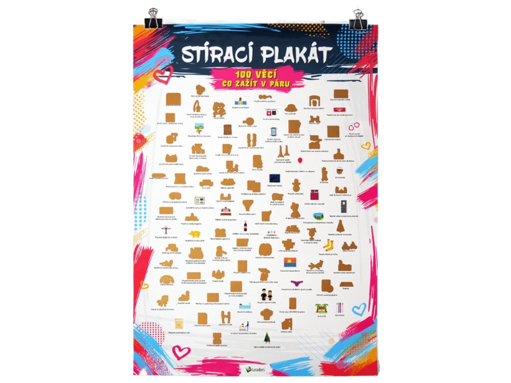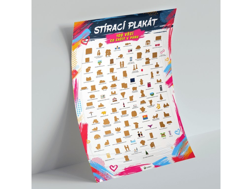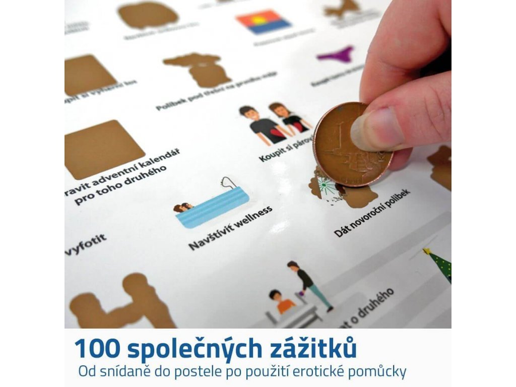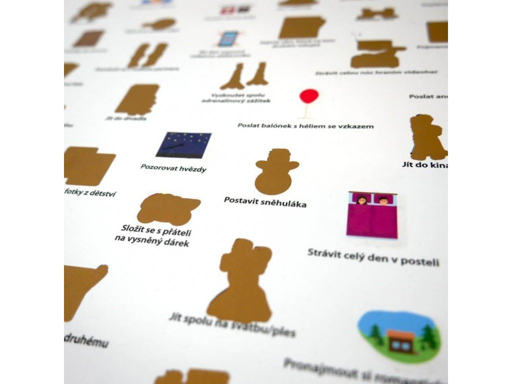 Od zavesenia zámku lásky, cez poslanie héliového balónika s odkazom do neba, prezradenia tajomstva z detstva, až po náhodné vycestovanie do neznáma. To všetko a ešte viac musíte zažiť s týmto stieracím plagátom zážitkov pre pár.