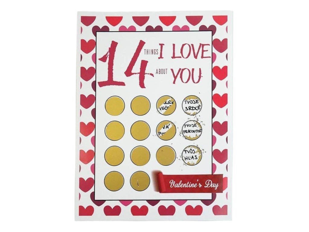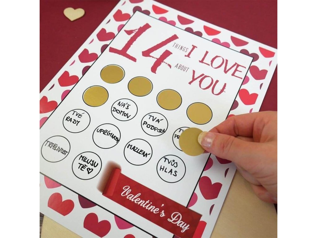 Prekvapte svoju lásku originálnym a osobitým darčekom, ktorý sami vytvoríte - darujte jej spomienku plnú emócií, ktorá jej bude každý deň pripomínať vašu lásku. Tento romantický darček vám umožní vyjadriť 14 dôvodov, prečo je pre vás taká výnimočná. Jednoducho napíšte svoje osobné vyznania do pripravených okienok a prekryte ich stieracími samolepkami. Každý odhalený dôvod potom prinesie dojímavé prekvapenie, z ktorého sa môžete spoločne tešiť.