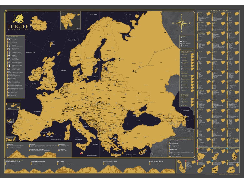 Vydajte sa na interaktívnu cestu po Európe s našou stieracou mapou! Tento jedinečný produkt v sebe spája krásny dizajn a praktickú pomôcku pre každého cestovateľa. Pod zlatou stieracou vrstvou sa skrýva podrobná mapa Európy, ktorá odhaľuje viac ako 300 atraktívnych miest. Uchovajte si svoje spomienky z ciest originálnym a kreatívnym spôsobom.