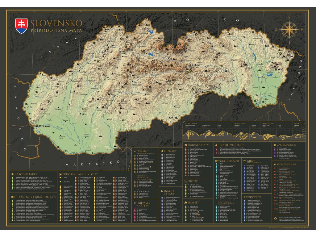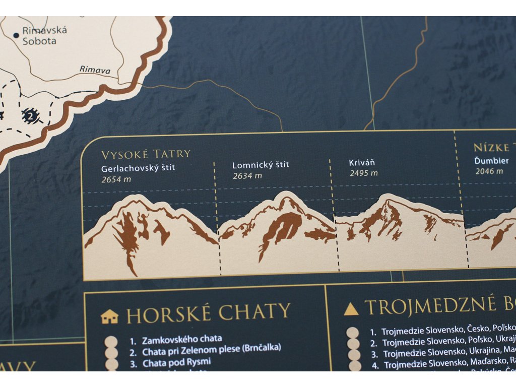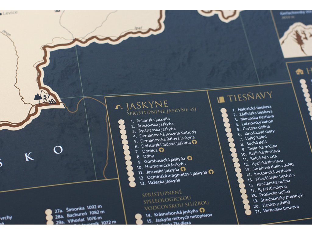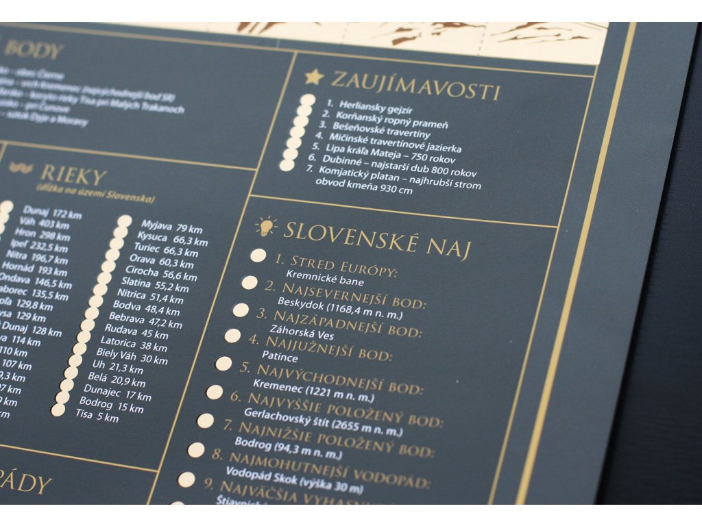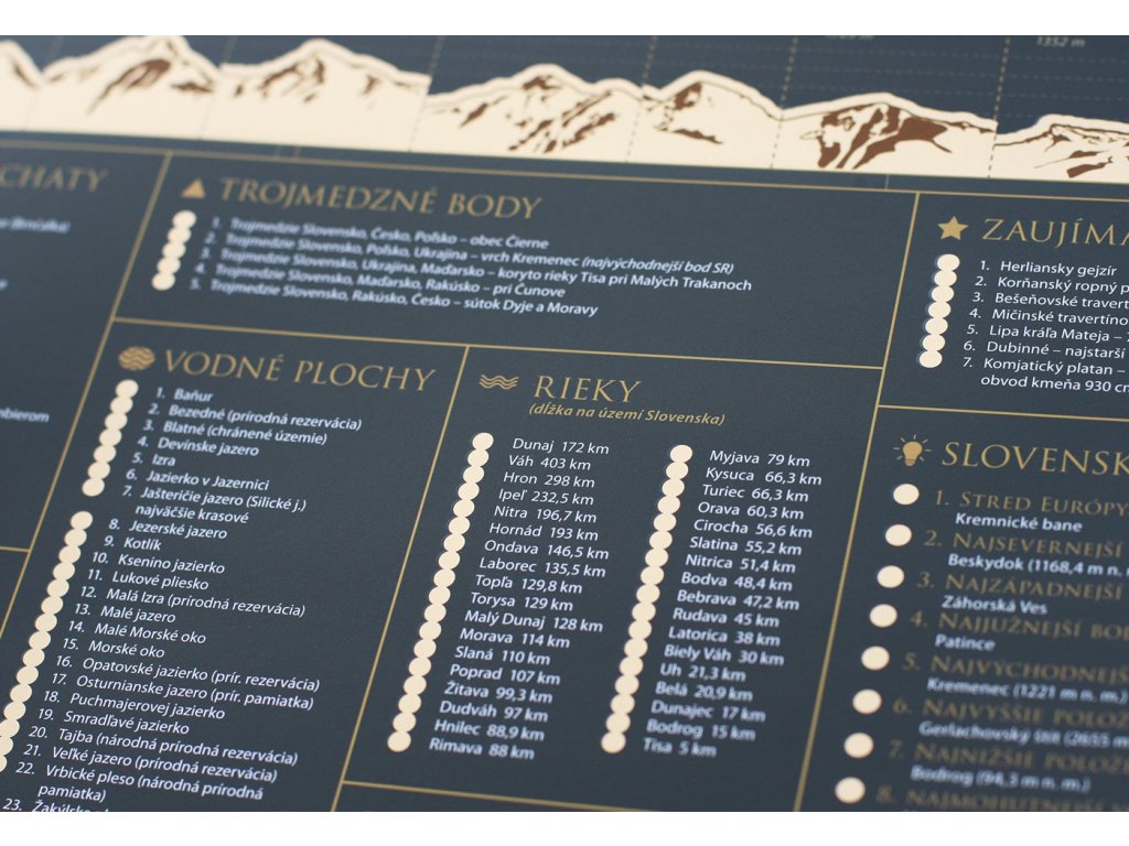 Vydajte sa na interaktívnu cestu po Slovenskej republike s našou stieracou mapou! Tento jedinečný produkt v sebe spája krásny dizajn a praktickú pomôcku pre každého cestovateľa. Pod zlatou stieracou vrstvou sa skrýva podrobná mapa Slovenskej republiky, ktorá odhaľuje pestré regióny, okresy a viac ako 300 atraktívnych miest, ako sú hrady, zámky, prírodné krásy alebo kultúrne pamiatky. Uchovajte si svoje spomienky z ciest originálnym a kreatívnym spôsobom.